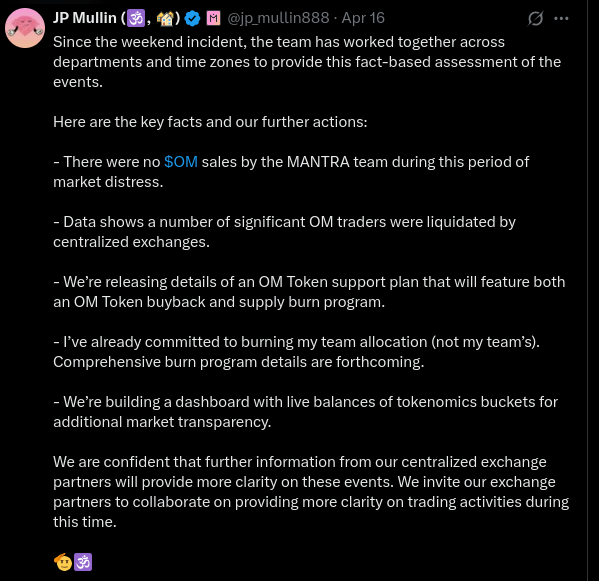 MANTRA’s CEO rapidly reassured users that the team is now working hard to jump-start the token’s recovery. On Apr 14, 2025, Mullin unveiled plans to initiate a buyback scheme, along with the intent to burn all OM tokens held by the project team. The team's supply totals 300 million tokens, representing about 17% of the total supply.