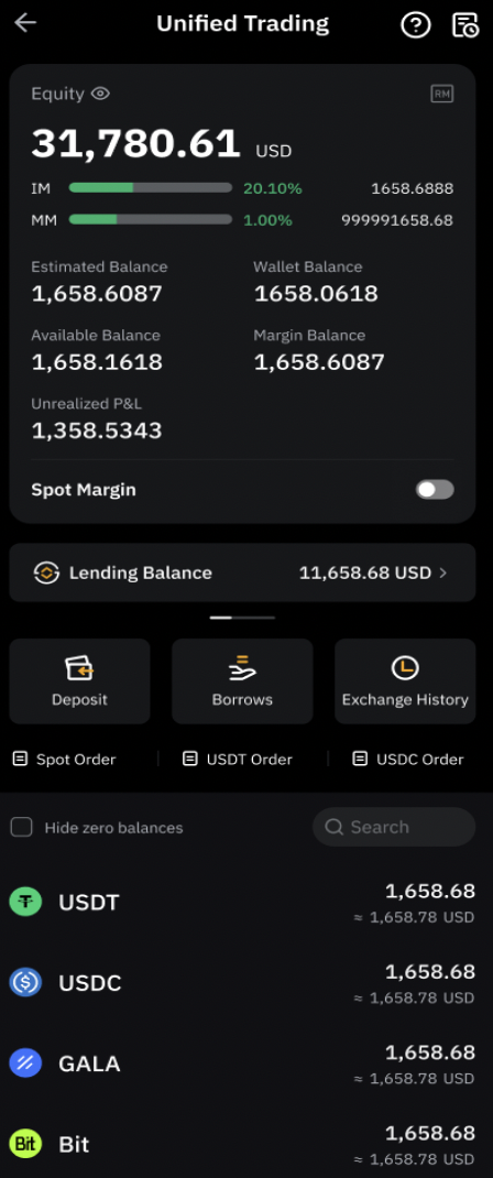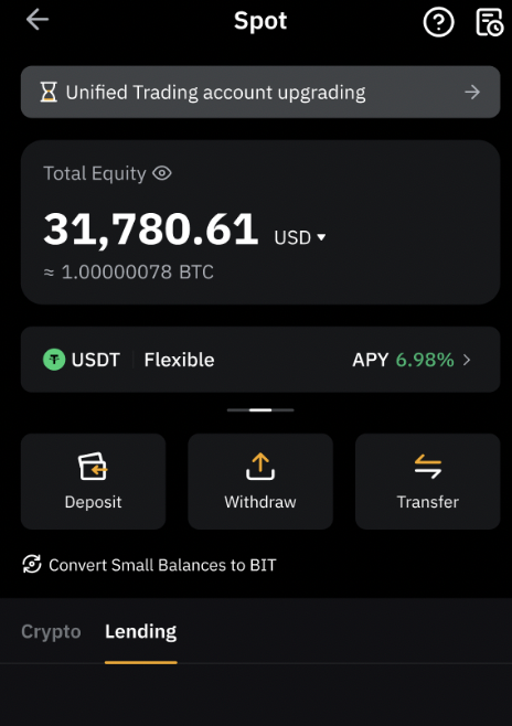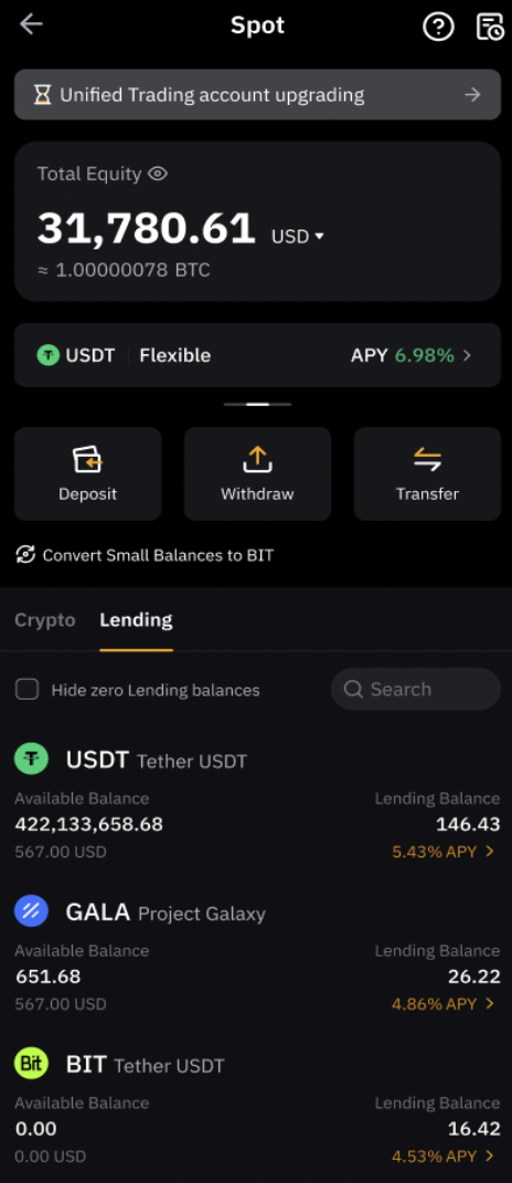 В аккаунте Bybit откройте меню и выберите Bybit Lending. После этого откроется страница Единого торгового аккаунта(UTA), где можно выбрать опцию Кредитование в подменю.