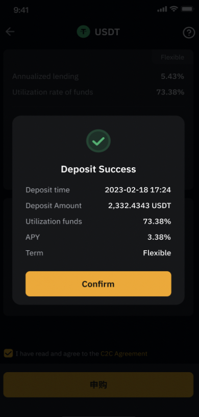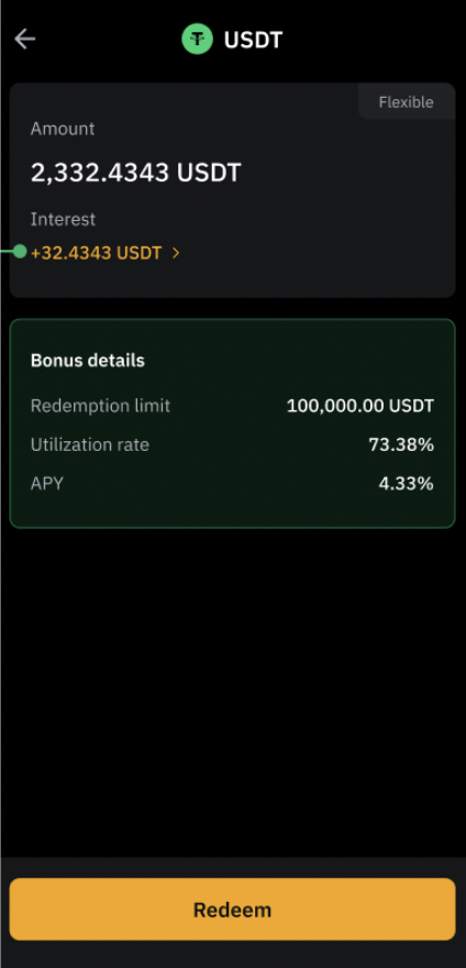 Подтвердите покупку после появления соответствующего уведомления. После этого на странице Кредитование появится информация о лимите погашения, расчётный APY и коэффициент использования займа. Здесь также представлена разбивка Процентов с информацией о почасовом доходе.
