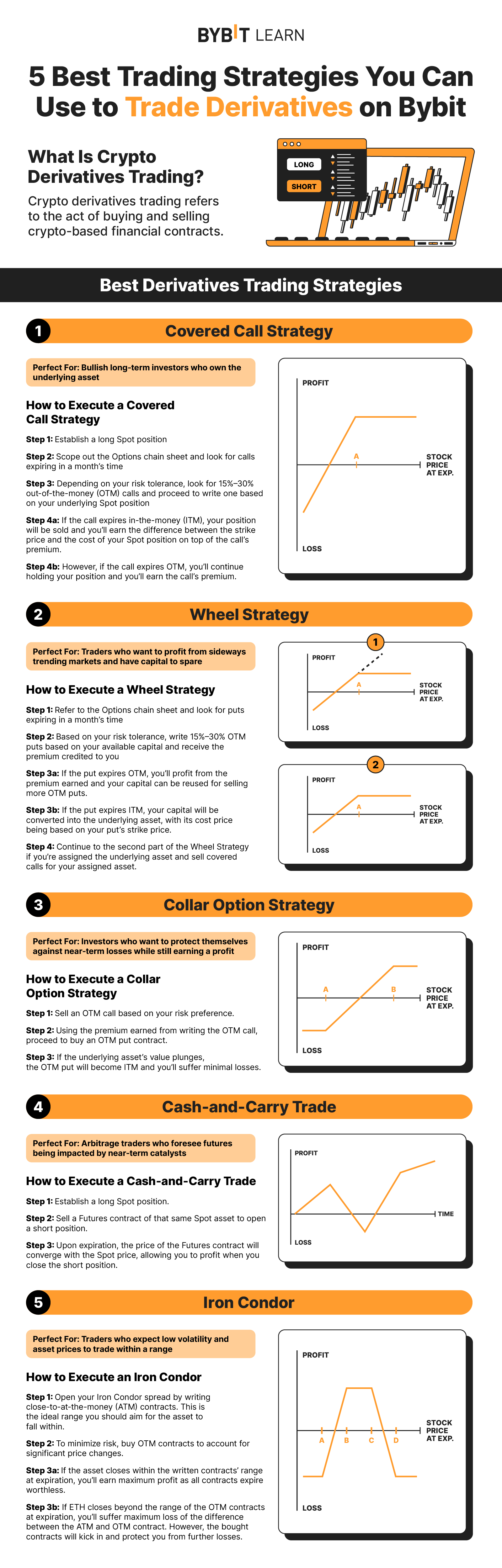 We hope that this article has been helpful in educating you about the best crypto derivative trading strategies you can employ on Bybit. From the Wheel Strategy to Cash-and-Carry arbitrage trades, the sheer variety of derivatives for trade with us allows informed traders to protect their capital while maximizing opportunities for growth, regardless of market conditions and sentiment.Â