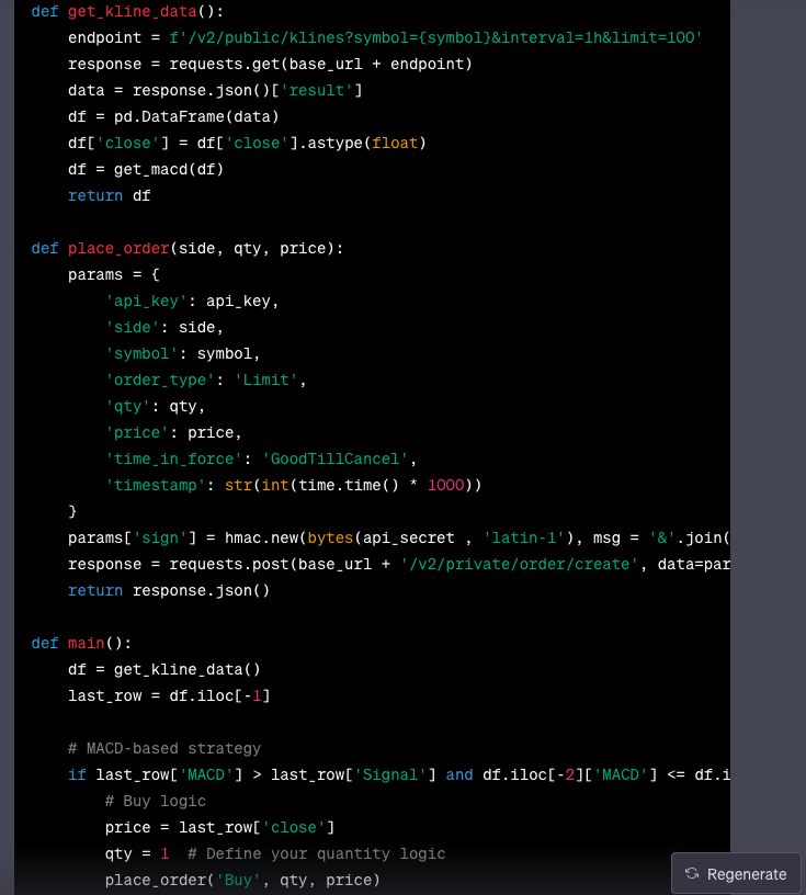 ChatGPT також може створити код, який допоможе реалізувати торгову стратегію на вибраній вами платформі. Однак він може включати не весь код, необхідний для автоматичного торгового бота, наприклад, обробку помилок і відстеження ордерів. Вам знадобиться протестувати й підігнати код, перш ніж використовувати його в реальному торговому середовищі.