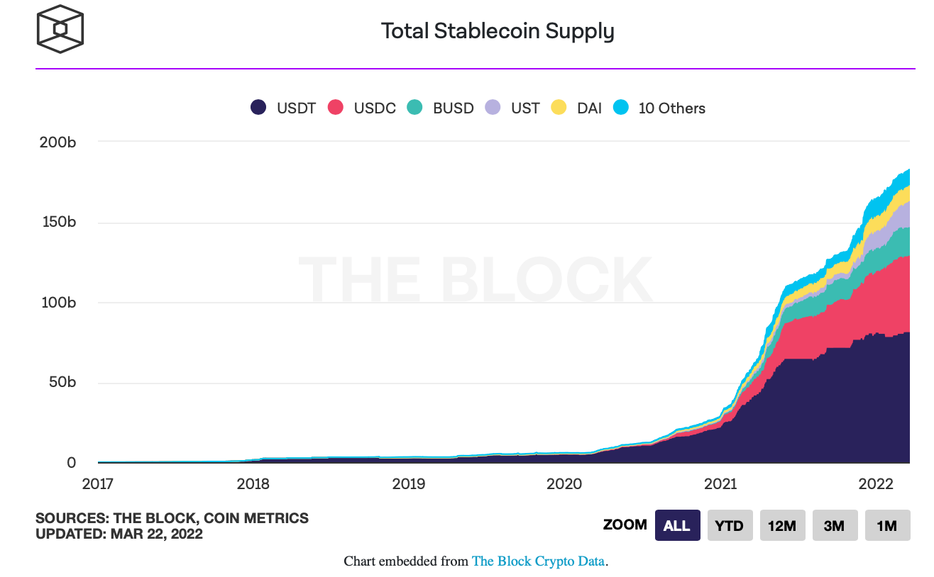 Tính đến ngày 30 tháng 8 năm 2021, khối lượng giao dịch của USDT là 75 tỷ, cao hơn so với hai loại tiền tệ còn lại. USDC có khối lượng 2,7 tỷ và stablecoin Binance USD có khối lượng thị trường là 5,8 tỷ. Tổng nguồn cung stablecoin được ghi nhận vào khoảng 116 tỷ, trong đó, USDT vẫn là stablecoin lớn nhất theo vốn hóa thị trường với tổng nguồn cung lưu hành là hơn 65,49 tỷ USDT. Trong khi USDC có nguồn cung lưu hành là 27,37 tỷ USDC và BUSD có nguồn cung là 12,25 tỷ BUSD.